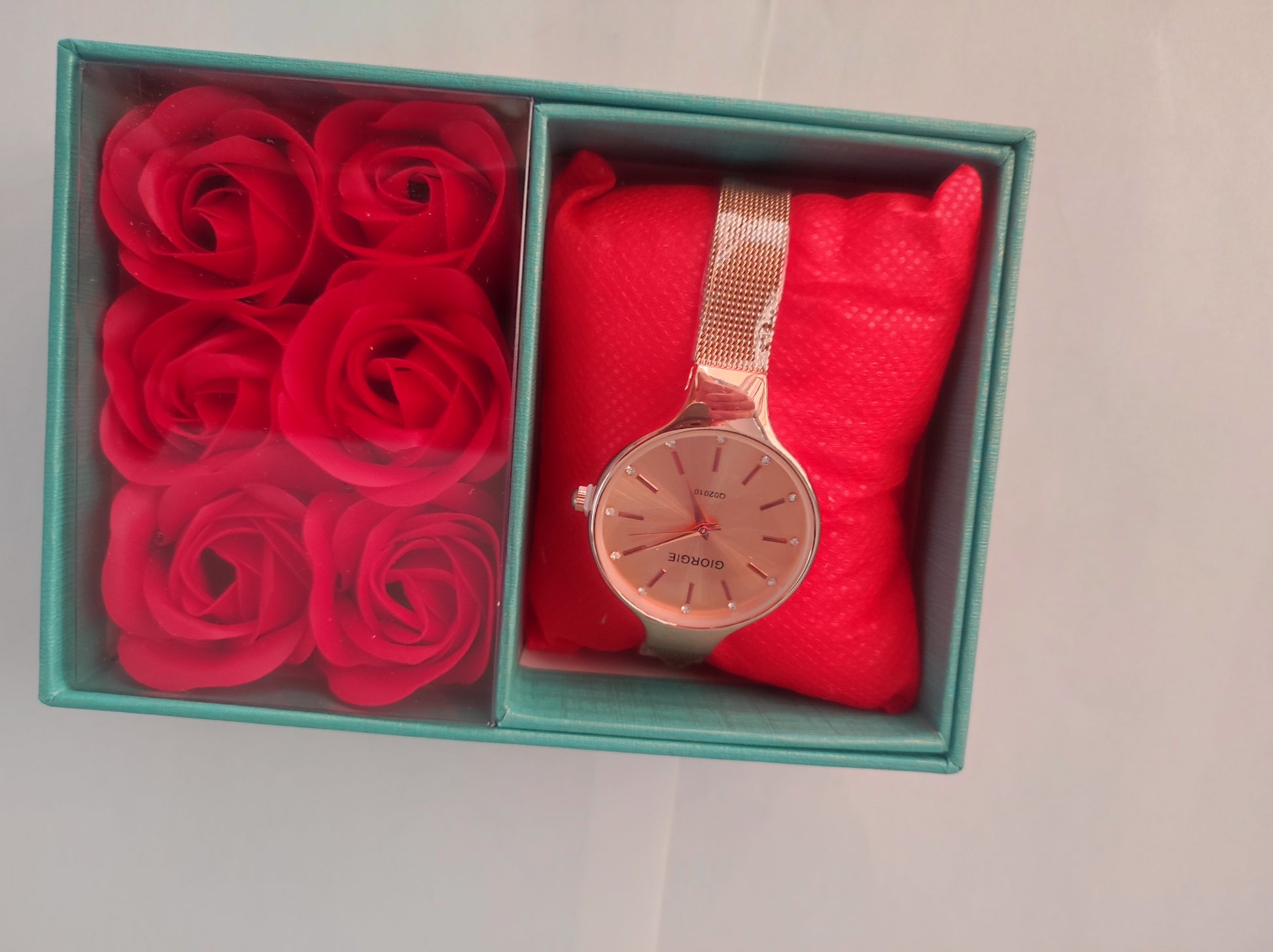 La caja de presentación adornada con rosas, lo que completa el conjunto, ofreciendo una experiencia visualmente encantadora y perfecta para regalo